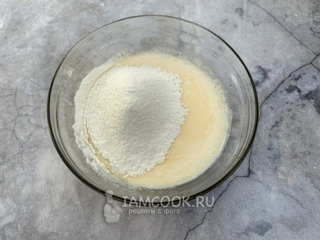 Просейте муку вместе с разрыхлителем прямо в жидкую смесь.