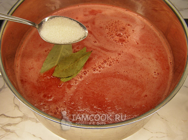 Добавляем в приготовленный сок сахар, соль, лавровый лист и ставим на сильный огонь. Доводим до кипения, после чего снижаем огонь и варим сок 15 минут, периодически перемешивая.