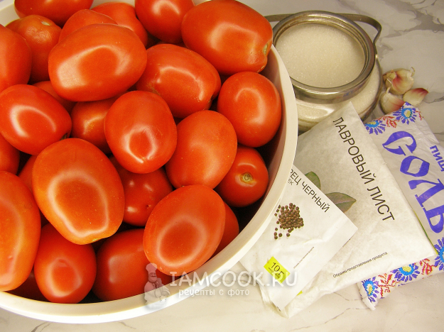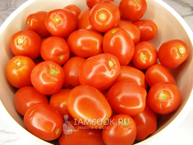 Соберём необходимые продукты для приготовления помидоров в собственном соку без уксуса на зиму. Для консервирования лучше всего брать небольшие плотные помидорчики с гладкой кожицей, без повреждений.