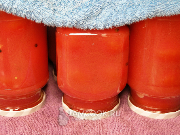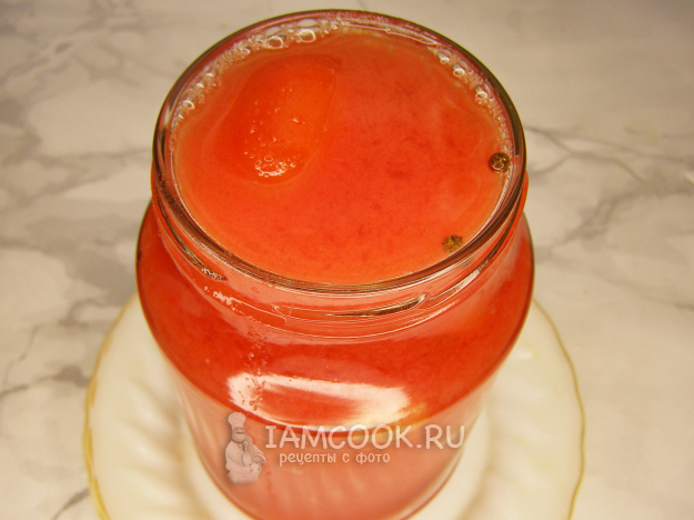 Вливаем в банки горячий томатный сок и сразу плотно закрываем крышками.