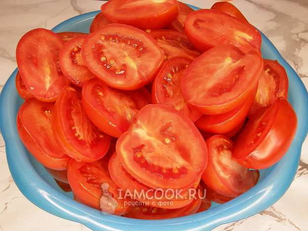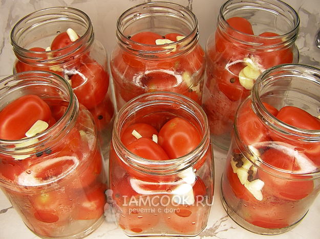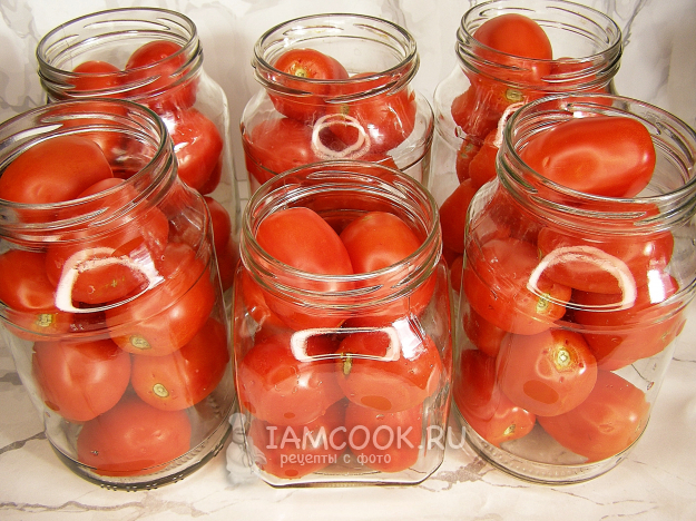 Банки хорошо моем, по желанию можно их простерилизовать, но это не обязательно. Раскладываем помидоры по банкам, не очень плотно.