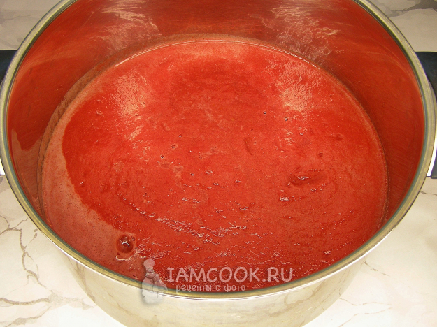 Отжимаем из помидоров сок. Удобно воспользоваться соковыжималкой, но если её нет, то можно измельчить их с помощью мясорубки или блендера, а затем полученное пюре протереть через сито, чтобы избавиться от кожицы и зёрнышек. Измеряем количество полученного сока. Если его получилось меньше, чем воды, слитой из банок, добавьте в сок необходимое количество чистой кипячёной воды.