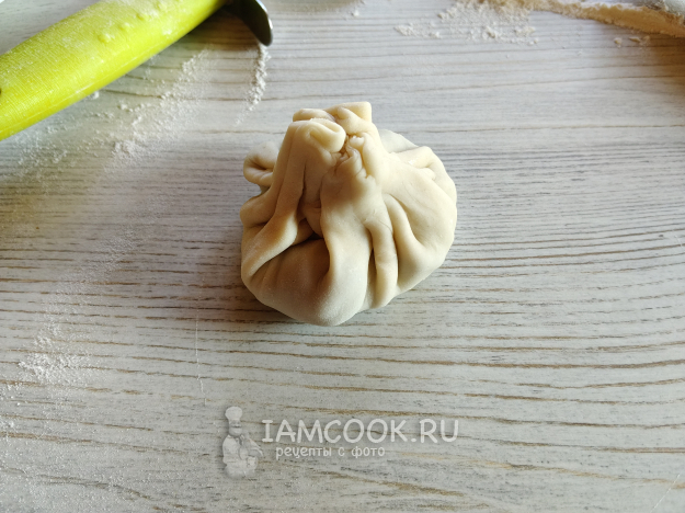 Защипнуть тесто сверху, складочками, хорошенько защипнуть в конце.