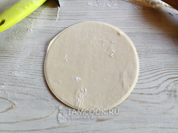 Раскатать тесто в тонкую лепёшку, вырезать по тарелке, чтобы был ровный круг.