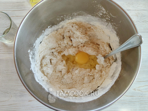 В муку добавить соль, перемешать, добавить масло.