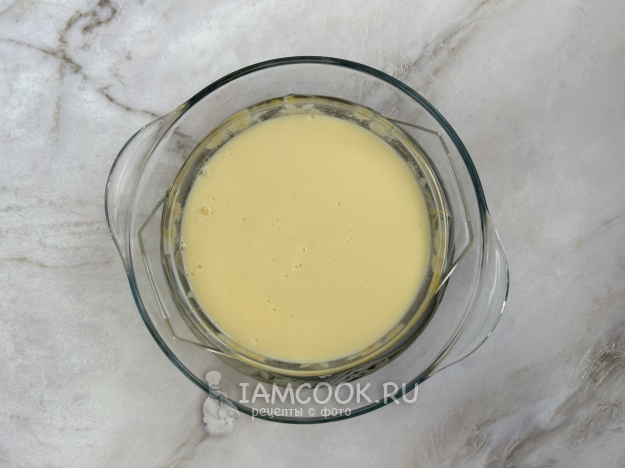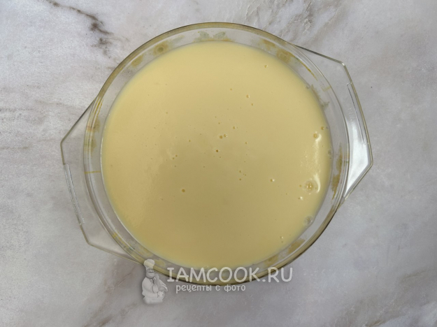 В большую форму налейте горячую воду. Постелите салфетку или полотенце. На неё поставьте форму с карамелью и молочной массой. Форму для запекания накройте фольгой. Запекайте пудинг 50-60 минут при температуре 160 градусов. Готовый пудинг должен слегка дрожать. Дайте ему остыть, затем поставьте в холодильник на 4-5 часов для стабилизации. После этого пройдитесь острым ножом по краям формы, накройте тарелкой и переверните.