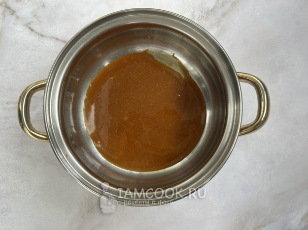 Постоянно помешивайте смесь деревянной ложкой, пока сахар полностью не растворится. Доведите смесь до кипения и варите около 5 минут, пока карамель не станет золотисто-коричневого цвета.