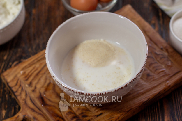 Манную крупу всыпьте в небольшую мисочку и залейте холодным молоком. Оставьте набухать на минут 10-15.