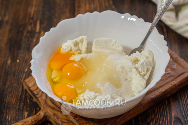 Добавьте к творогу яйца и сахар. Тщательно перемешайте. Если хотите получить более гладкую запеканку, без крупинок, то измельчите массу погружным блендером.