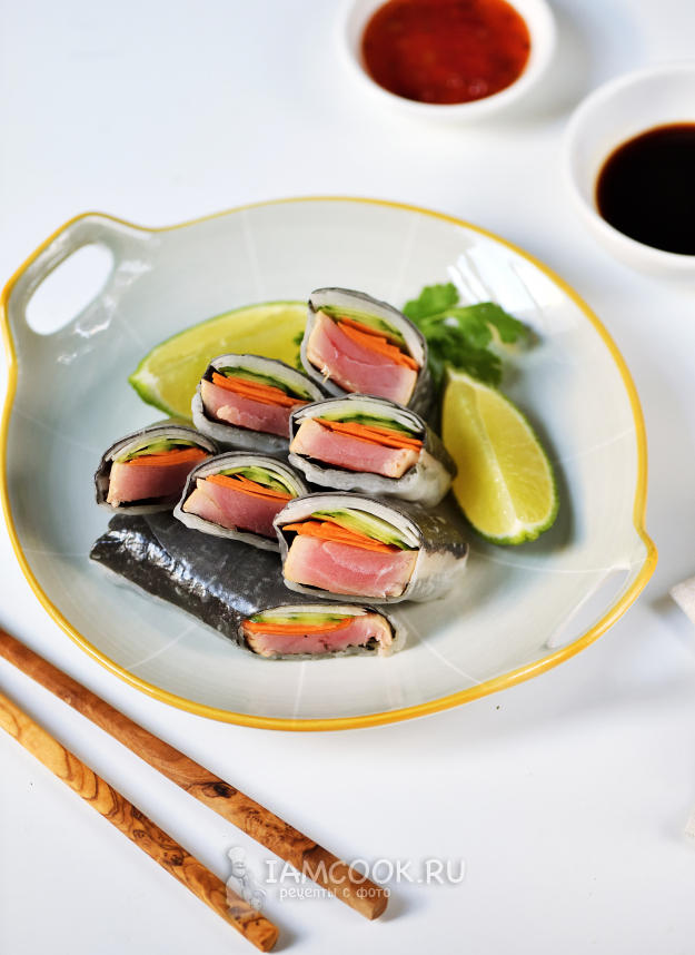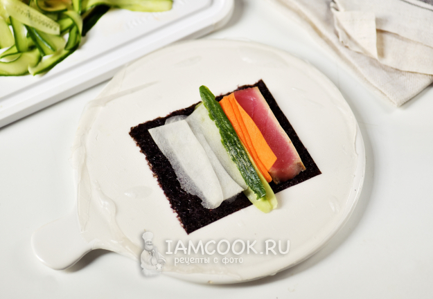 Налейте в миску подходящего диаметра холодную воду, выложите в нее лист рисовой бумаги, держите секунд 30. Переложите рисовую бумагу на гладкую поверхность, в центр положите кусочек нори, сверху выложите ломтик обжаренного тунца и по несколько ломтиков моркови, дайкона и огурца. Сверните все рулетом, подвернув края. То же самое проделайте со всеми ингредиентами.
