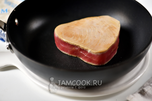 Тщательно промокните рыбу бумажным полотенцем, затем на хорошо разогретой сухой сковороде кратко обжарьте тунца с обеих сторон. Буквально секунд по 30 с каждой стороны, чтобы внутри он остался сырым.