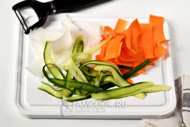 С помощью той же овощечистки нарежьте овощи тонкими ломтиками.