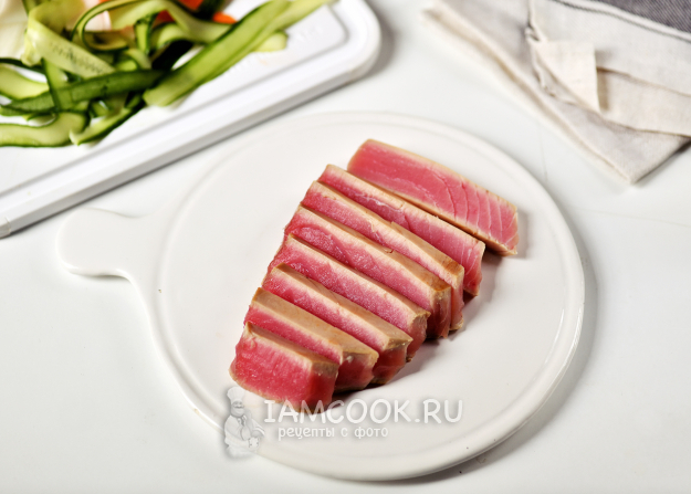 Дайте тунцу остыть, нарежьте поперек волокон острым ножом, ломтики должны быть толщиной около сантиметра.
