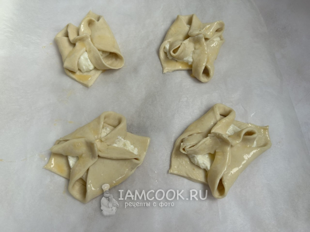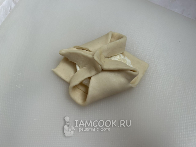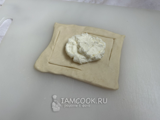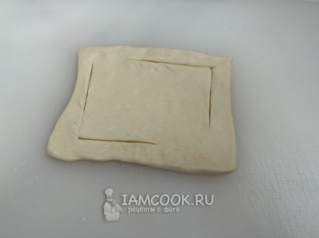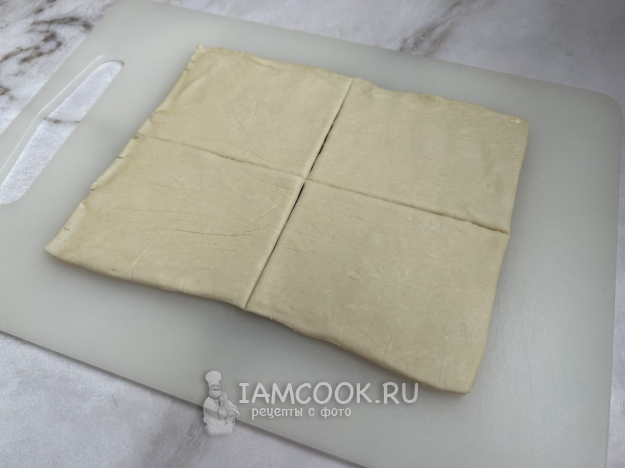 Разморозьте слоёное тесто согласно инструкции. Раскатайте тесто тонким слоем, толщиной около 3 мм. Нарежьте тесто квадратиками размером примерно 8х8 см.