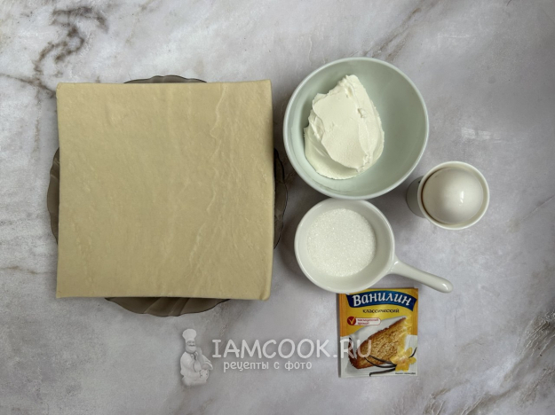 Соберите по списку все необходимые ингредиенты для приготовления булочек с маскарпоне из слоеного теста.