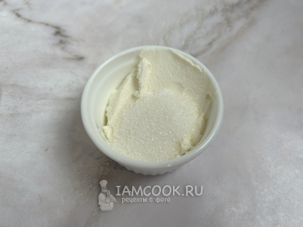 В миску выложите сыр маскарпоне. Добавьте сахар и ванилин. Тщательно перемешайте ингредиенты ложкой или миксером, до однородной массы.