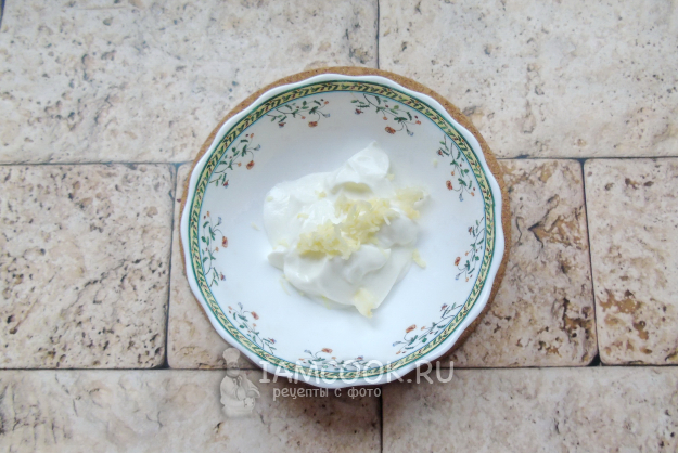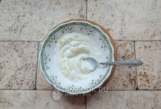 Натуральный йогурт выложите в мисочку, добавьте измельченный чеснок и соль.