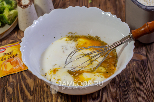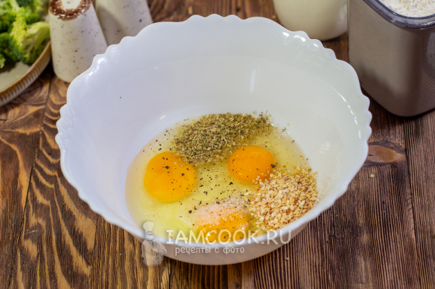 Для теста в миску вбейте куриные яйца, добавьте соль, черный молотый перец, немного сушеного орегано и чеснока.