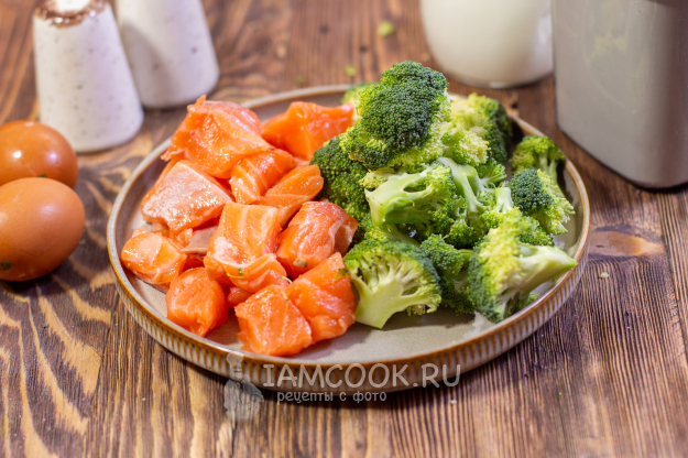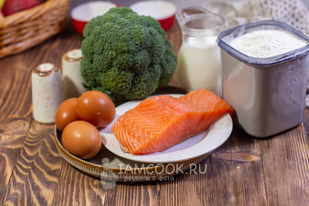 Соберите необходимые продукты для приготовления заливного пирога с брокколи и красной рыбой. Для теста я взяла кефир средней жирности, яйца и муку. В качестве начинки использовала свежее филе семги, которую можно заменить на любую другую красную рыбу. А также я взяла свежую брокколи, которую можно заменить на замороженную. Если используете замороженную, то разморозьте и хорошо отожмите от лишней жидкости.