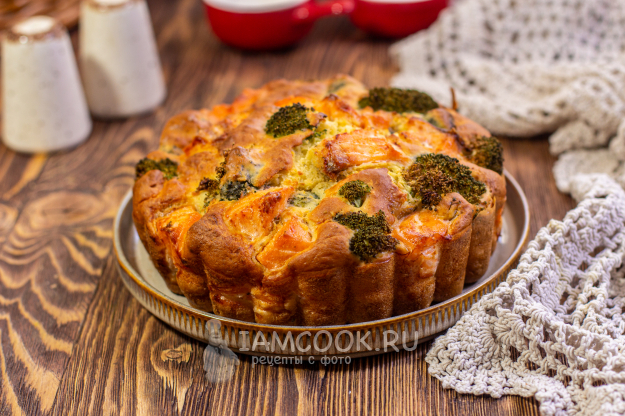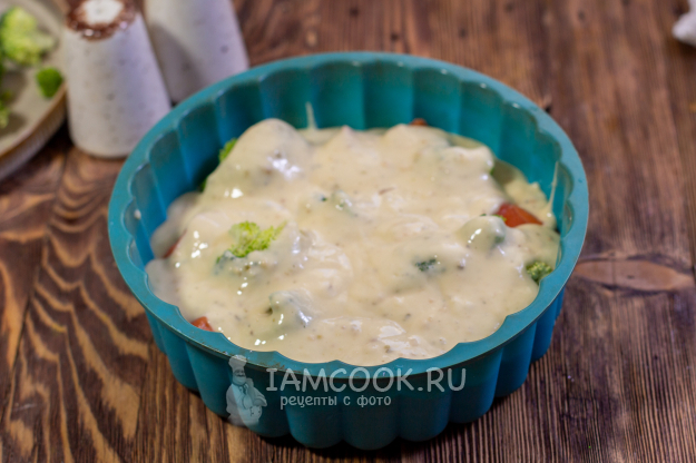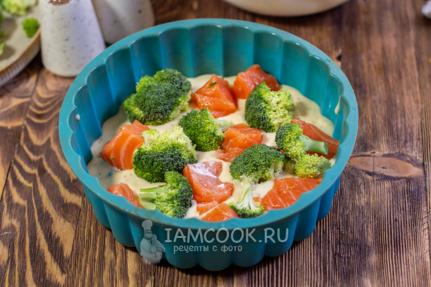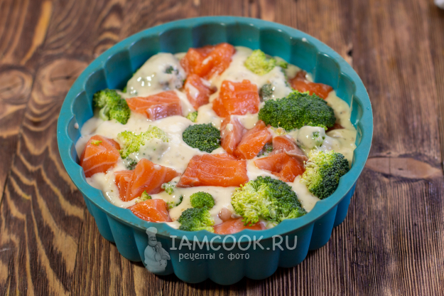И разложите отложенные рыбу и брокколи. Поставьте пирог в заранее разогретую до 170 градусов духовку на 40-45 минут.