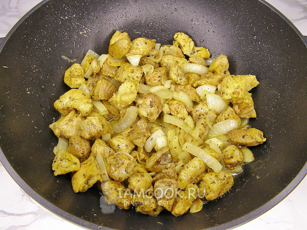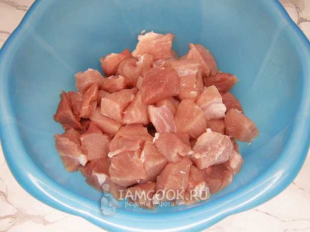 Мясо нарезаем на кусочки среднего размера, чуть меньше, чем кусочки для шашлыка.