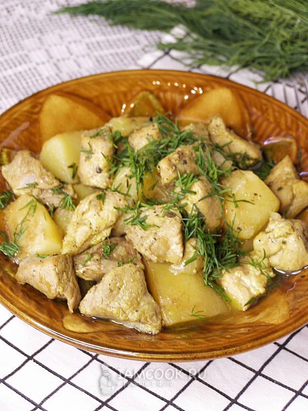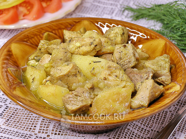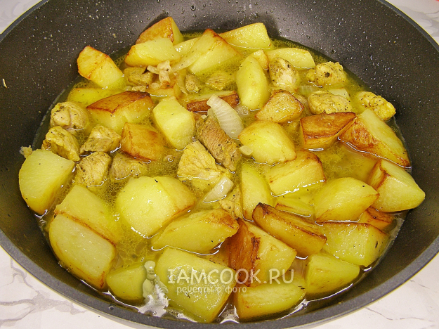 Перекладываем картошку обратно в казан с мясом, добавляем воду, солим по вкусу и доводим до кипения. После закипания накрываем казан крышкой и тушим на медленном огне около часа.