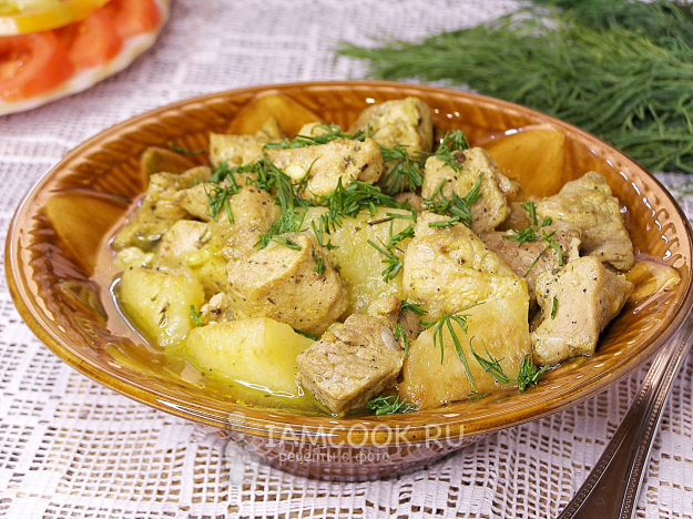 Казан-кебаб из свинины готов. Подаём его к столу в горячем виде, со свежими овощами и зеленью. Приятного аппетита!