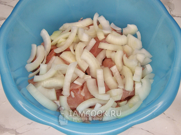 Лук нарезаем полукольцами или четверть-кольцами и кладём в мясо.