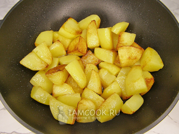 В казан наливаем растительное масло, разогреваем его на сильном огне и в горячее масло выкладываем картофель. Обжариваем, помешивая, пока кусочки не подрумянятся. Обжаренный картофель выкладываем из казана в миску.