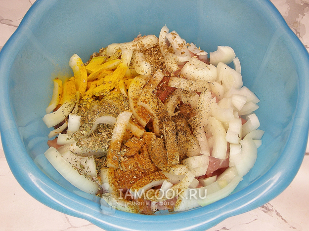 Добавляем соль и специи. Всё хорошо перемешиваем и оставляем минимум на полчаса мариноваться.