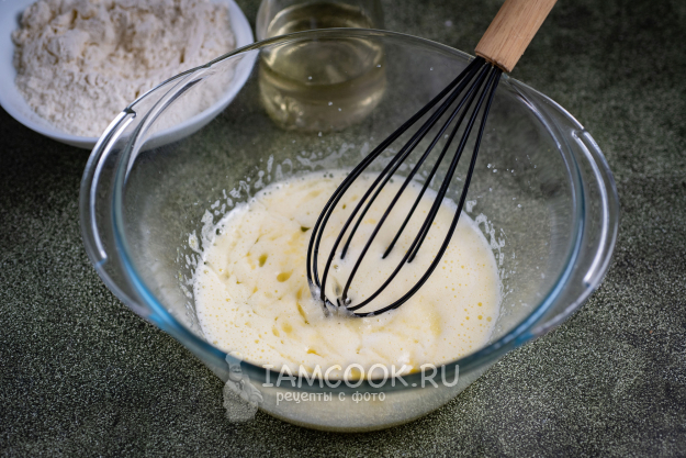 Добавьте молоко, растительное масло. Венчиком все перемешайте.