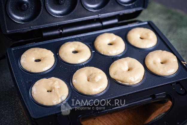В мультипекаре установите рабочие панели для приготовления пончиков, смажьте формочки тонким слоем растительного масла. Разогрейте мультипекарь, в формочки выложите тесто чайной ложкой.