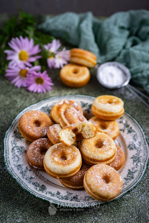 Готовые пончики подавайте к столу, чуть присыпав сахарной пудрой. Приятного аппетита!