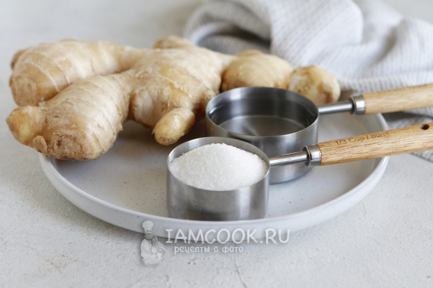Для приготовления ферментированного имбиря нам понадобятся чистая банка с крышкой и всего три ингредиента: корень имбиря, сахар и фильтрованная вода.