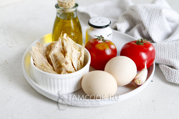 Все необходимые ингредиенты для приготовления яичницы с курицей и помидорами - перед вами.