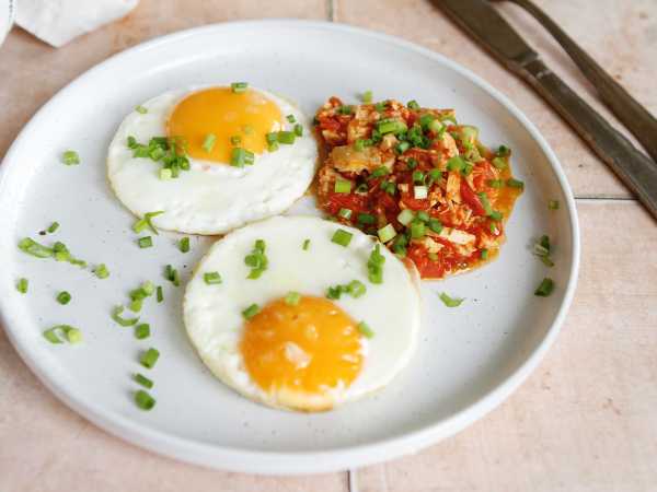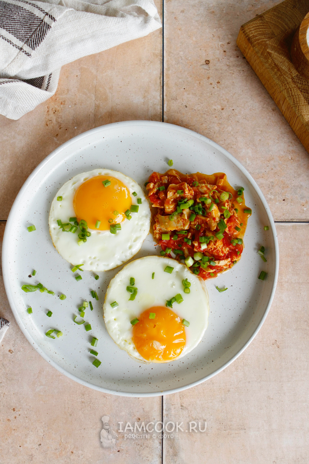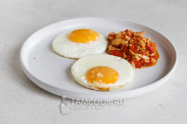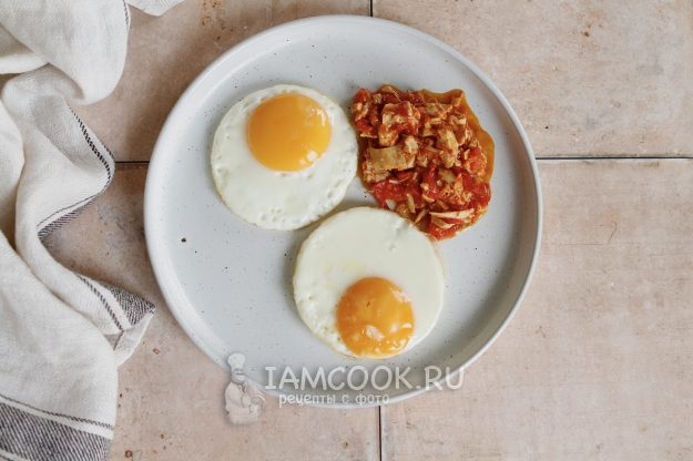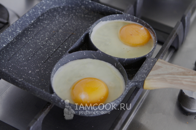 На другой сковороде пожарьте два яйца желаемой прожарки.