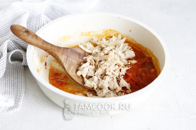 Разделайте филе грудки. Добавьте ее в сковороду и прогрейте еще пару минут вместе с помидорами.