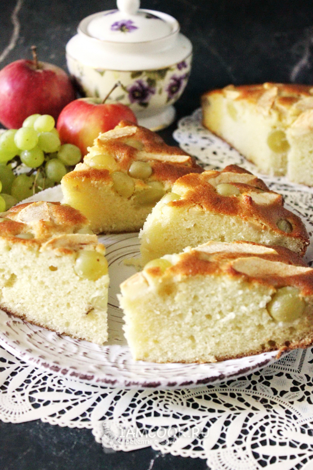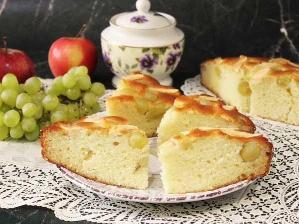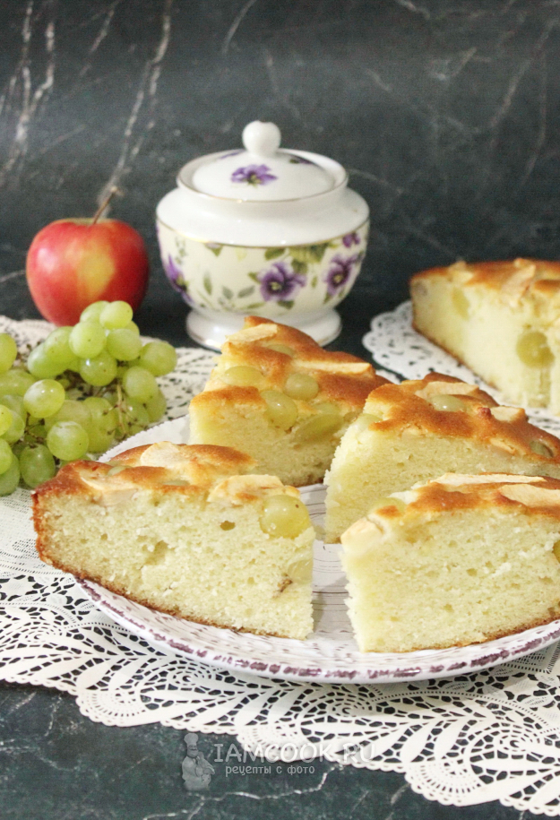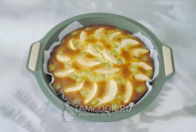 Выпекайте пирог с яблоками и виноградом в духовке, разогретой до 175-180 градусов, 40-45 минут. Температурный режим и время выпекания зависят от вашей духовки.