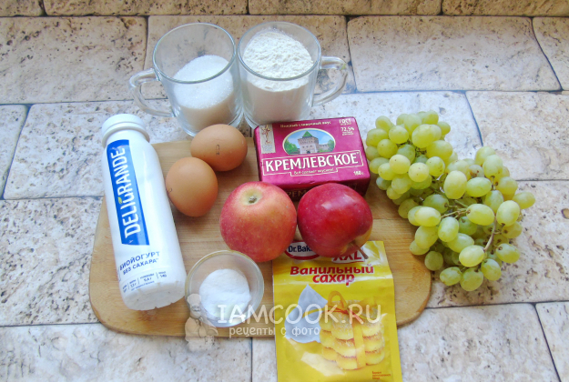 Соберите ингредиенты для приготовления пирога с яблоками и виноградом в духовке.
