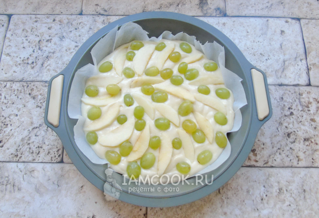 Выложите тесто в форму для выпечки с пекарской бумагой. Яблоки помойте, очистите, удалите семенную коробочку и нарежьте дольками. Выложите с виноградом на тесто.
