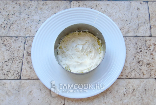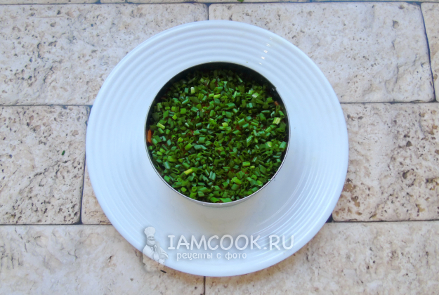Зеленый лук мелко нарежьте и выложите на слой моркови. Можно тоже смазать майонезом.