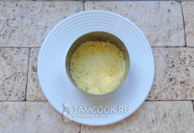 Картошку отварите в подсоленной воде, охладите и натрите на терке. Можно сварить в кожуре или очищенную, значения не имеет. Выложите на блюдо первым слоем в салатное кольцо. Если нет кольца, то просто на блюдо.