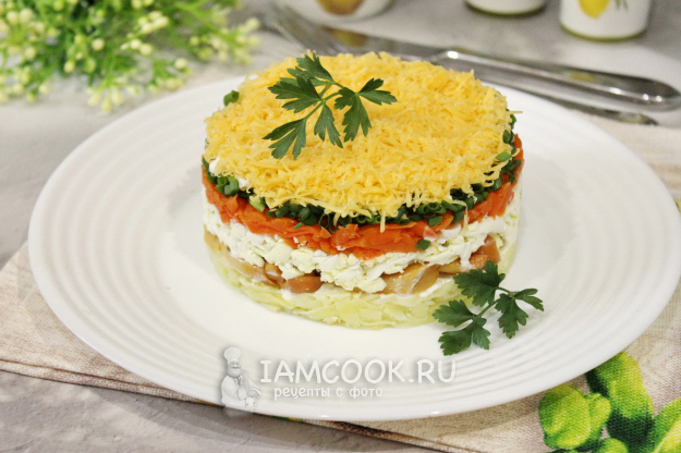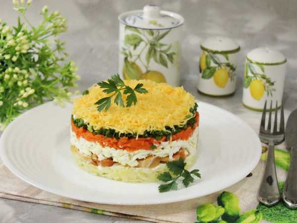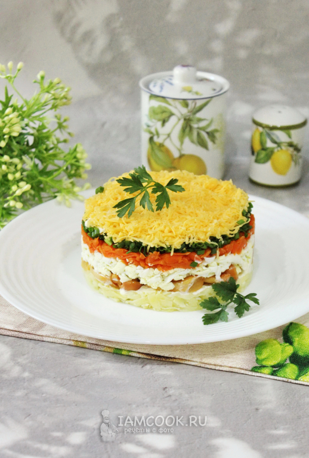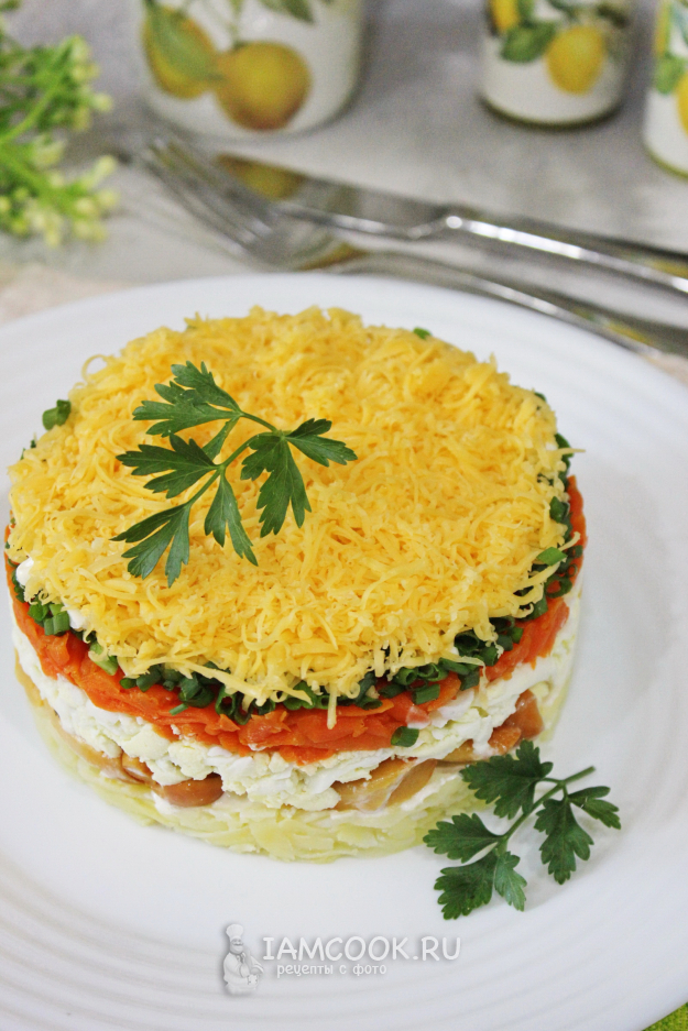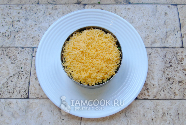 Сыр натрите и выложите последним слоем. Это будет верх салата.