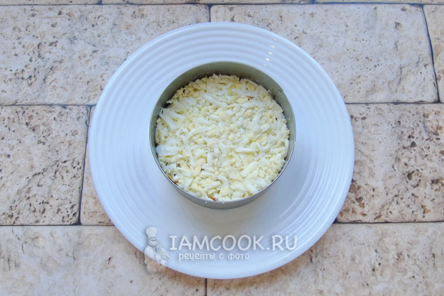 Яйца выложите в кастрюлю, залейте водой и варите с момента закипания 10 минут, вкрутую. После охладите, очистите и натрите на терке. Это третий слой салата. Яйца можно посолить и поперчить. Смажьте майонезом.