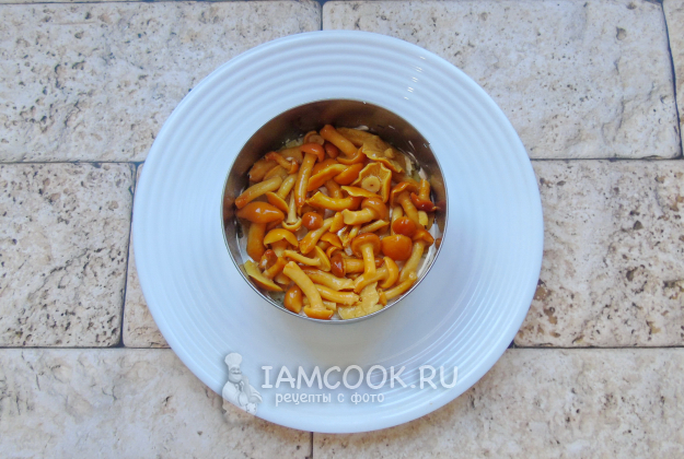 Вторым слоем идут маринованные грибы. Крупные грибы нарежьте. У меня были мелкие опята. Этот слой смазывать майонезом не нужно.