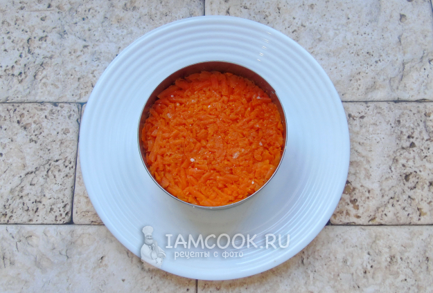 Морковь отварите, охладите и натрите на терке. Выложите следующим слоем и смажьте майонезом.