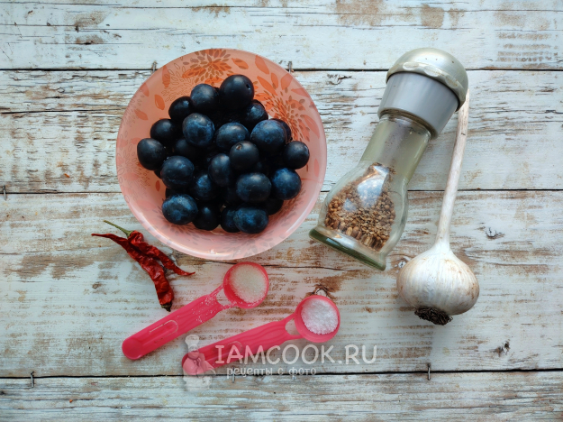 Соберите по списку продукты для приготовления аджики из терна на зиму. Терн должен быть достаточно спелым, но не перезрелым, чтобы ягоды не были подвержены брожению в заготовке. По желанию в состав ингредиентов можно добавить зелень, но нужно учитывать, что в таком случае потребуется добавление уксуса либо дополнительная стерилизация закуски.
