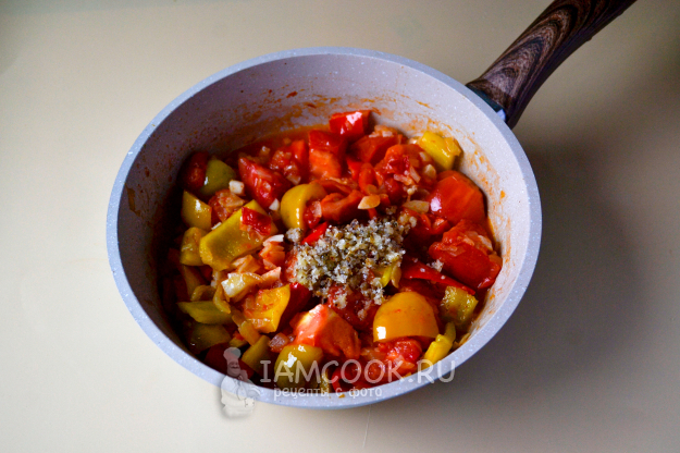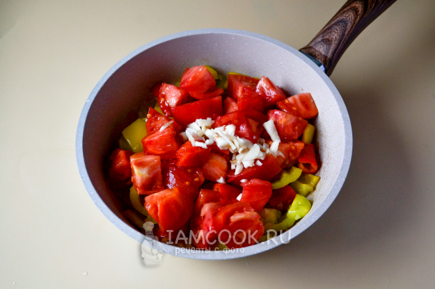 Положите в сковороду помидоры и чеснок. Перемешайте, жарьте еще 6-7 минут, помешивая.