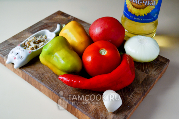 Соберите продукты для приготовления болгарского перца с помидорами на сковороде. Помидоры и перцы вымойте и обсушите. Лук и чеснок очистите. Специи возьмите по вкусу. Я использую сванскую соль.