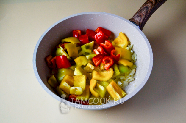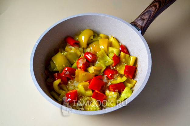 Положите в сковороду перцы.